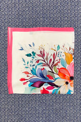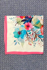 Dette silketørklæde har creme baggrund, storblomstret print i klare pink, turkise, orange og blå farver med en klar pink bord.