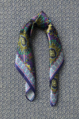 Dette silketørklæde er med klar lilla baggrund med psykedelisk mønster i forskellige gule, grønne, mørk lilla og orange farver med en mint, orangerød, orangegul og en lidt lysere lilla mønstret bord