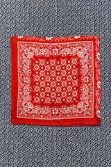 Dette silketørklæde er med klar rød baggrund, sjalsmønster i råhvid. Tørklædet er delt op i fire sektioner, med hver sit mønster.