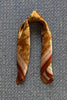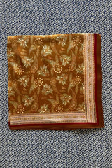 Dette silketørklæde har rust brun baggrund med blomster/sjalsmønster i armygrøn og hvid med en bord af rosa, armygrøn og brune små blomster og en bordeaux og brun kant yderst.