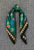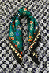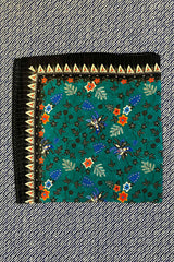 Dette silketørklæde har en dyb tyrkis baggrund med små blomster i rød, orange, klar blå, sort og creme. Tørklædet er afsluttet med en fin bord i sort med creme og rødt trekants mønster.