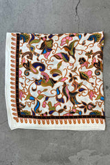 Dette silketørklæde er cremefarvet med sjalsmønster i rosa, blå, grøn, lilla og sort.
